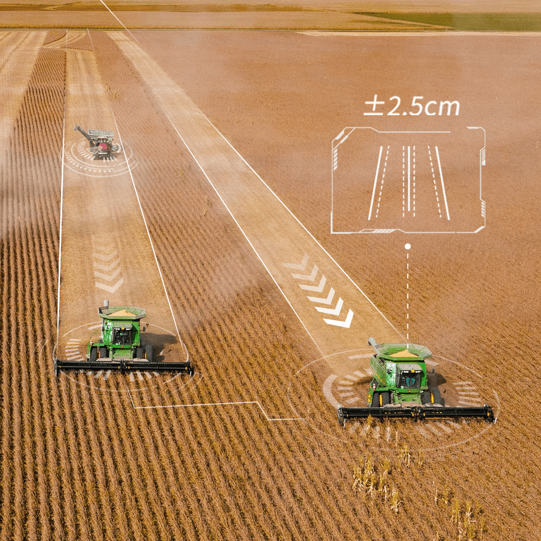 Precisión. 2,5 cm de alta precisión. Al combinar las tecnologías GNSS y RTK, este sistema de dirección automática del tractor logra una precisión de 2,5 cm y la función de compensación del terreno garantiza una alta precisión en campos inclinados.