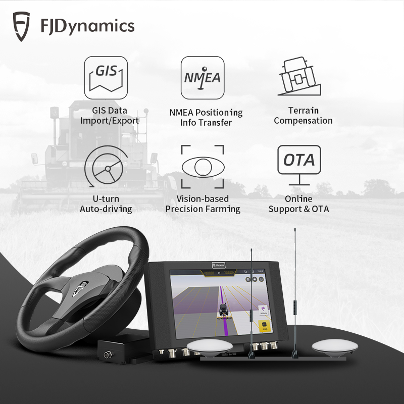 Fácil uso, manos libres. El kit de dirección automática FJD se puede instalar fácilmente en 30 minutos, y la unidad automática de giro en U logra un verdadero manos libres en las operaciones agrícolas.