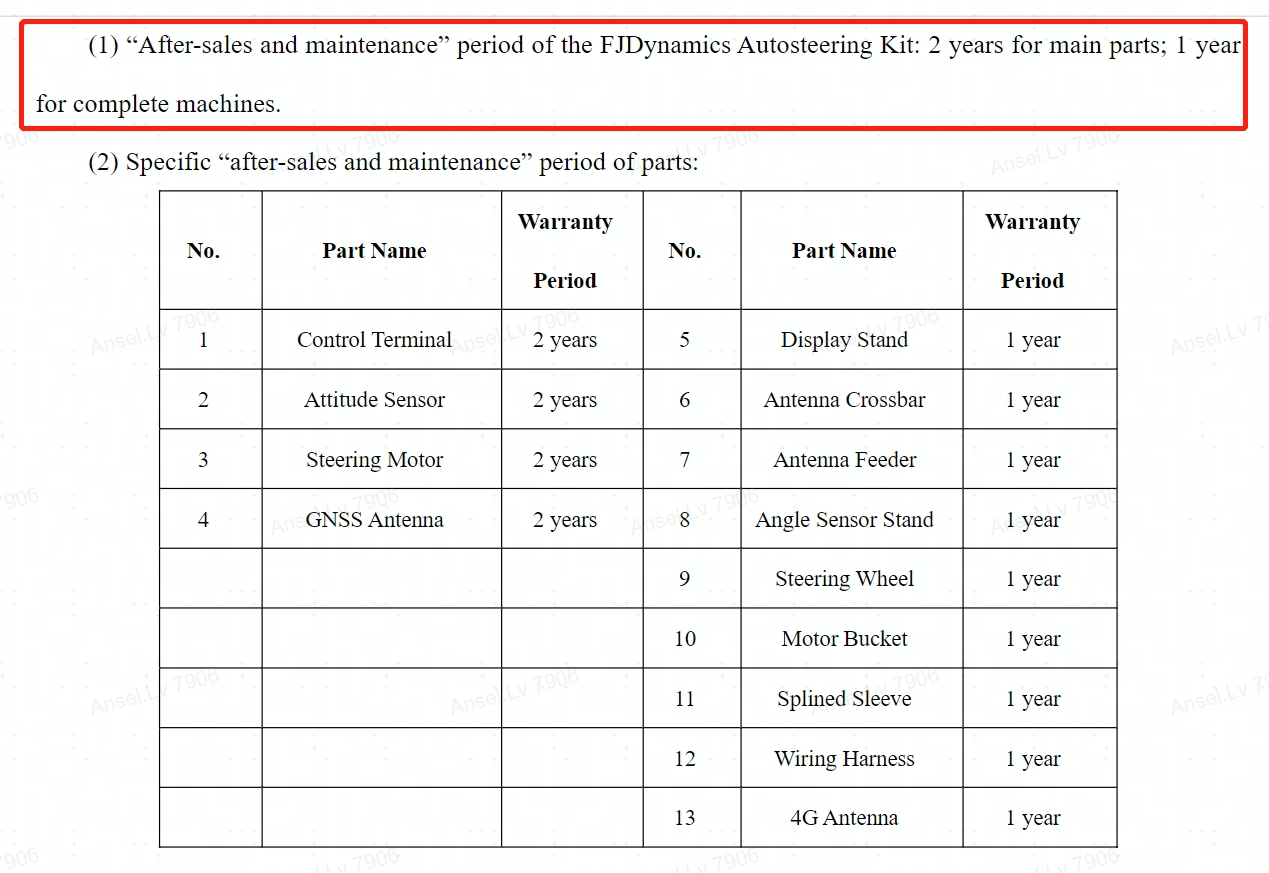 2 años para las piezas principales, como terminal de control, IMU, motor de dirección, antena GNSS, módulo de sensor de ángulo;